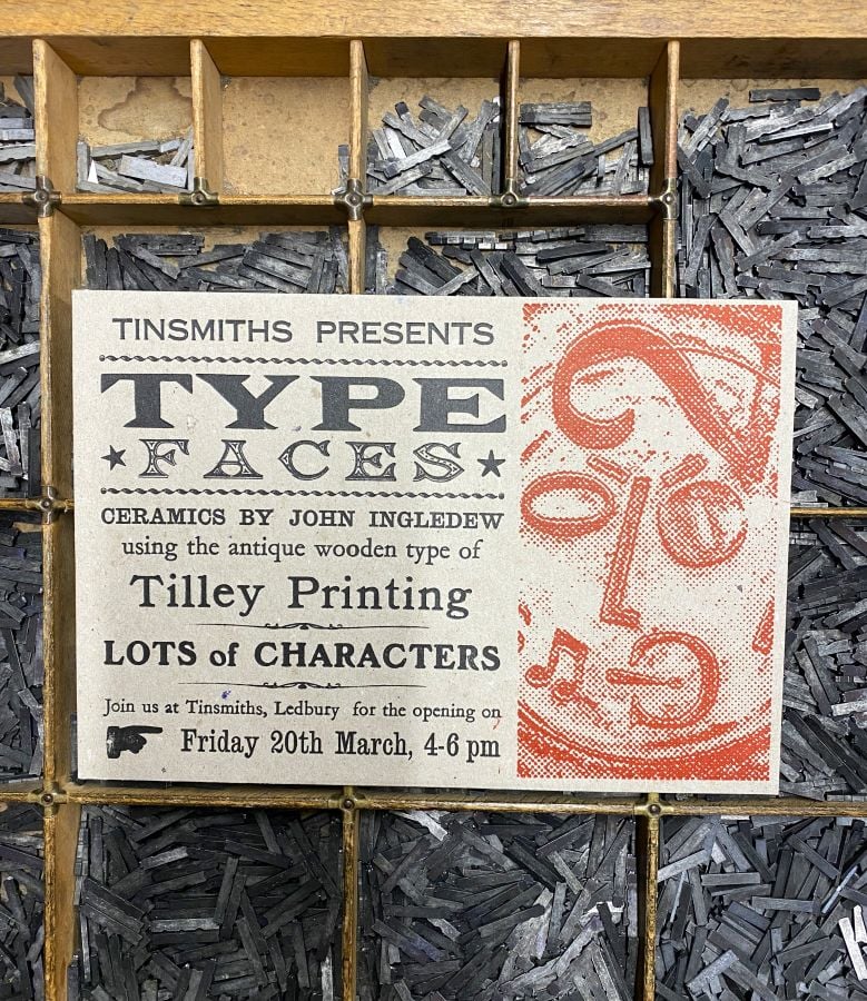 Over the last five years John has turned his attention to working with clay and has combined this interest with his love of letterpress. After seeing some of John’s work using type blocks pressed into clay, Tinsmiths’ Phoebe Clive suggested a collaboration with Ledbury’s legendary Tilley Printing.