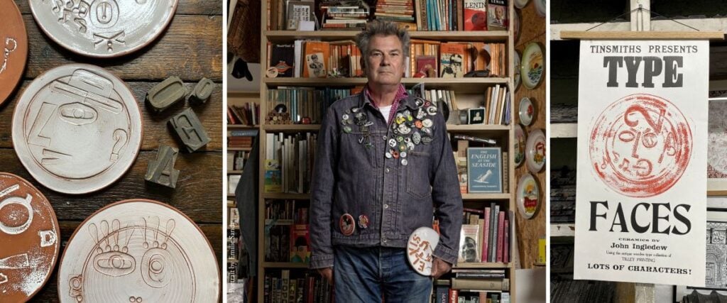 A letterpress poster printed by Martin Clark at Tilley Printing, Ledbury, to coincide with Tinsmiths’ Type Faces exhibition 2026. An exhibition of ceramic pieces by artist, John Ingledew.